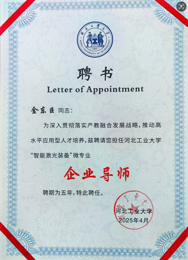 其二,双导师制强化实践赋能。 金博士作为河北工业大学企业导师,与高校教师共同承担教学任务:课堂上,他以“激光焊割工艺优化”“激光设备安全标准”等产业前沿问题为切入点,引导学生用理论知识解决实际挑战;课后,通过“企业项目工作坊”带领学生参与凯普林研发项目。