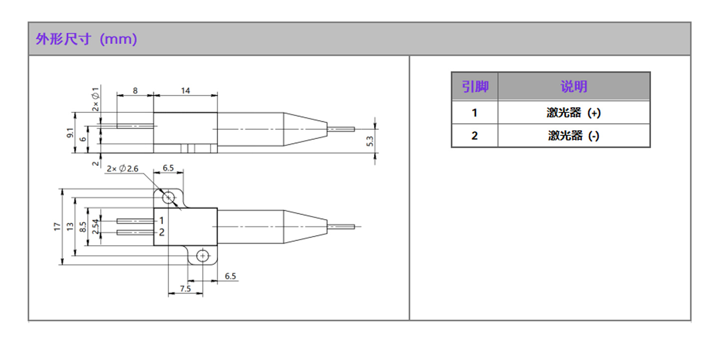 -工作电流在6A以上的激光器请采用焊接方式连接引线,焊接点尽量靠近引脚中部,温度低于260℃,焊接时间小于10秒。