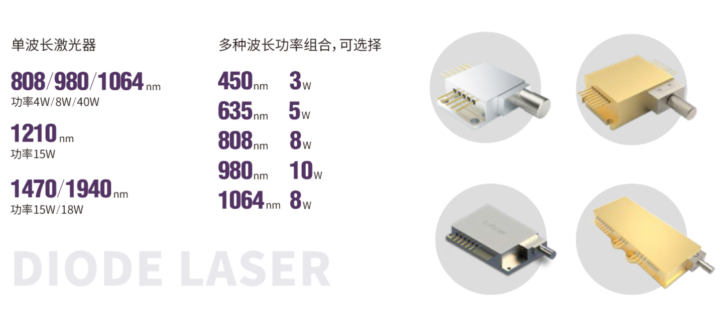 凯普林医用半导体激光器产品具有高效、精准、体积小、寿命长等优势,能够为多种医疗技术和精准治疗设备提供可靠光源。波长覆盖700nm至2000nm的近红外光、400nm至700nm的可见光以及400nm以下的紫外光,产品功率范围从0.2W至200W,包含11针 /14针等单波长系列以及MP/AG等多波长系列的医用半导体激光器,提供插拔及光纤两种输出方式,产品种类全、波长覆盖广,同时融合多项关键核心技术,可实现多波长同光纤输出。