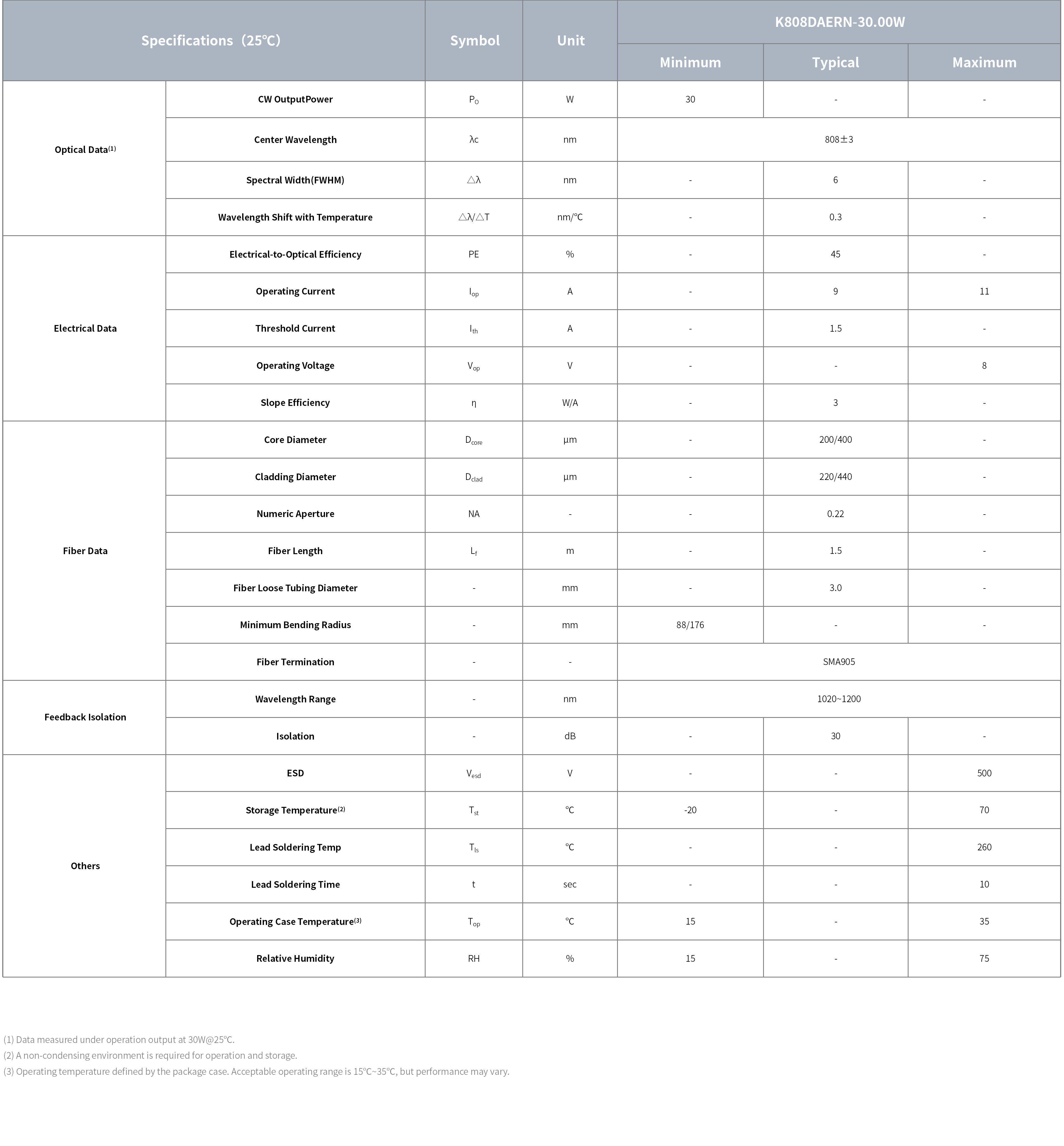 - Make sure the fiber output end is properly cleaned before operation of laser. Follow safety protocols to avoid injury when handling and cutting the fiber.- Use constant current power supply to avoid surge current during operation.