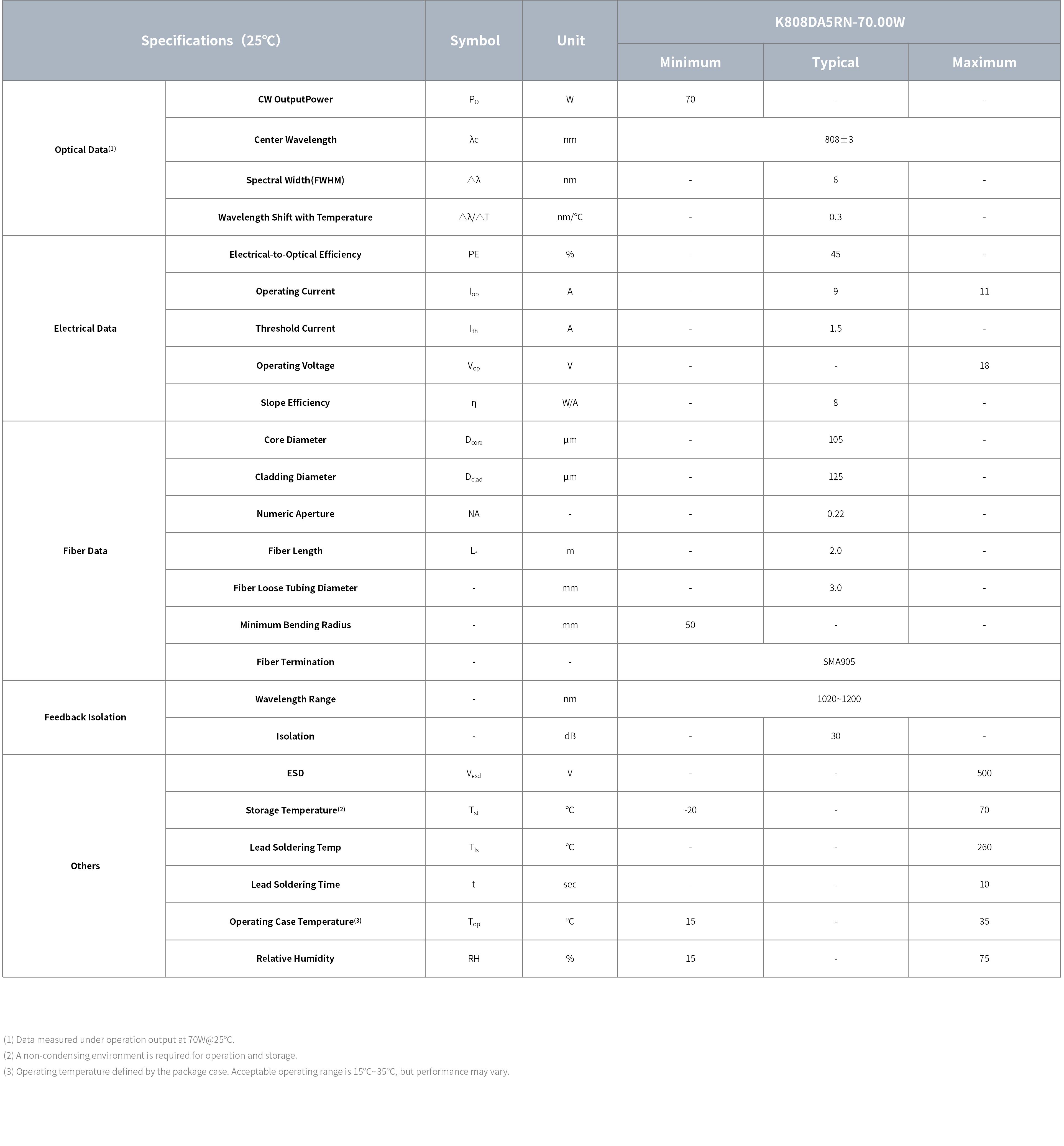 - Make sure the fiber output end is properly cleaned before operation of laser. Follow safety protocols to avoid injury when handling and cutting the fiber.- Use constant current power supply to avoid surge current during operation.